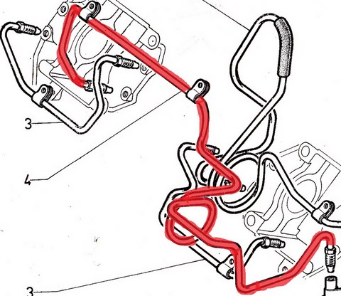 Tuyau de frein AVD de l'etrier au raccord 2 voies fixé sur le longeron.